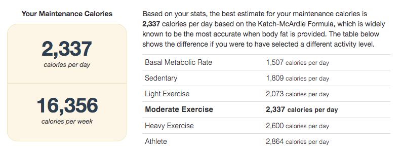 For example, entering in my data shows that my maintenance calories are 2,337 per day.